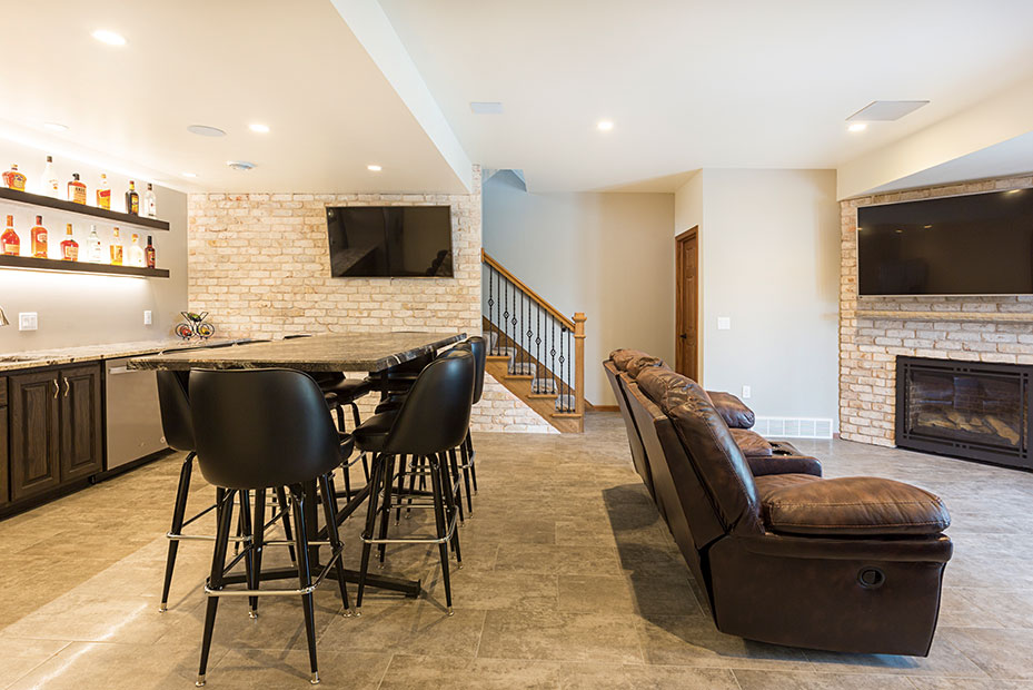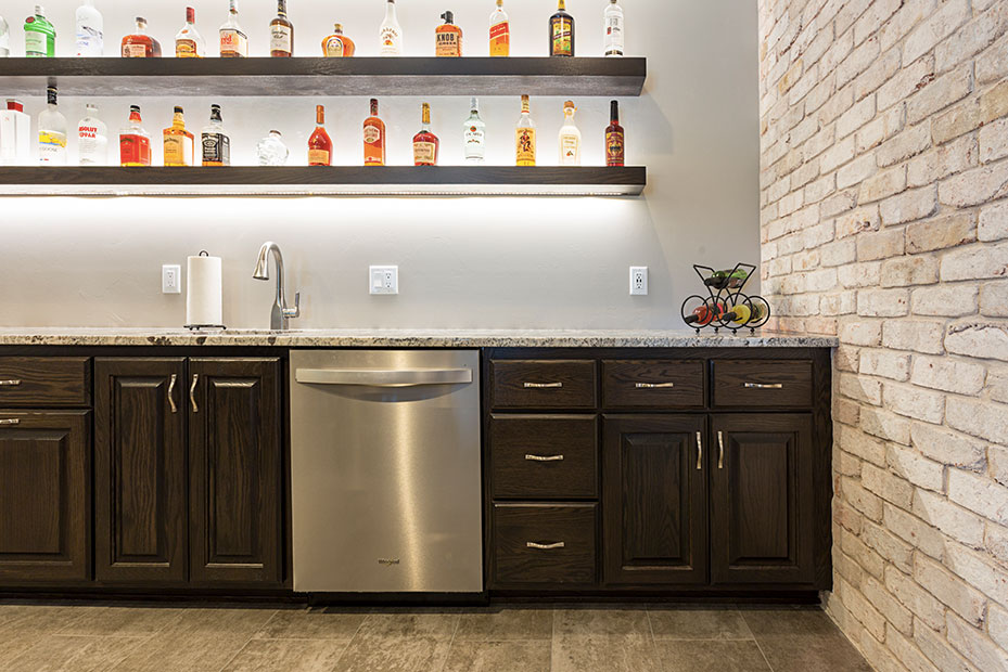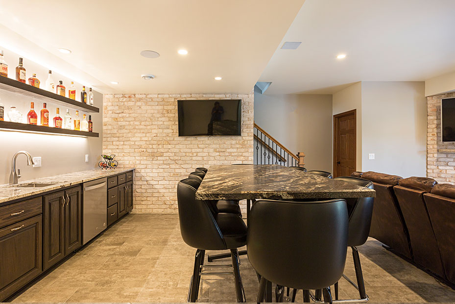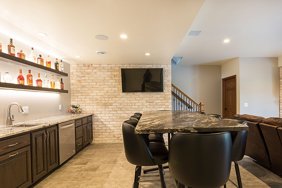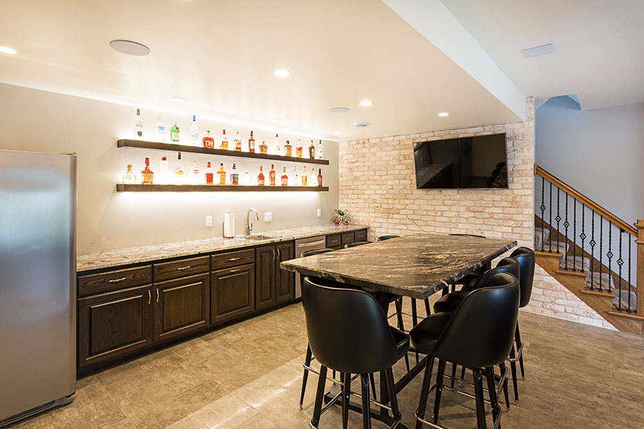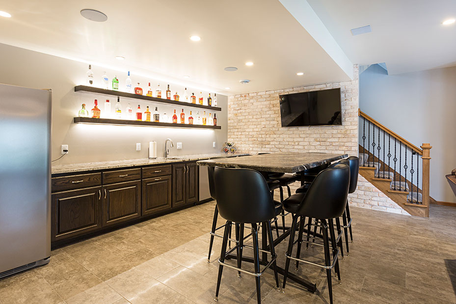 Basement Bar With a basement remodel like this, there is no question where party will be! Complete with beautifully lit floating shelves, TVs for the game, and the wet bar for storage and functionality, this basement is a hit.
