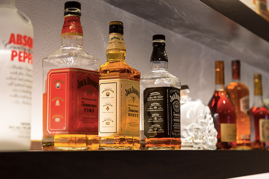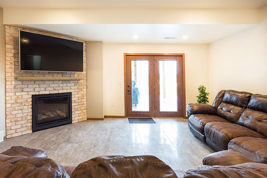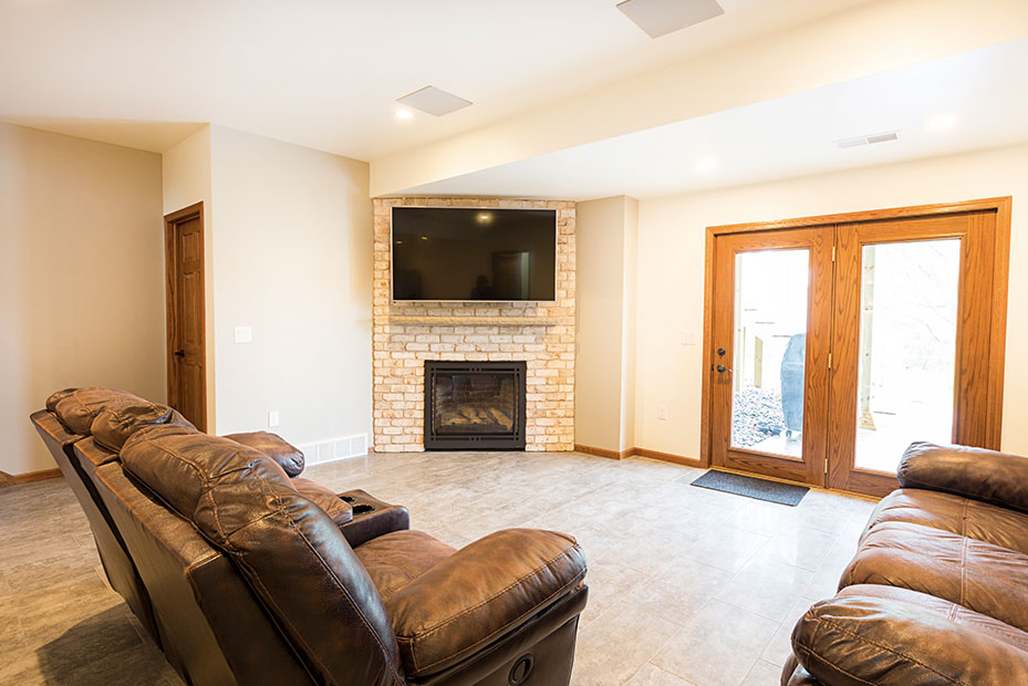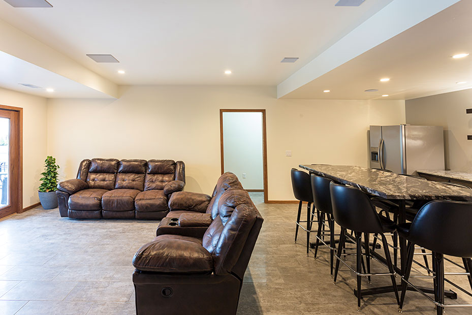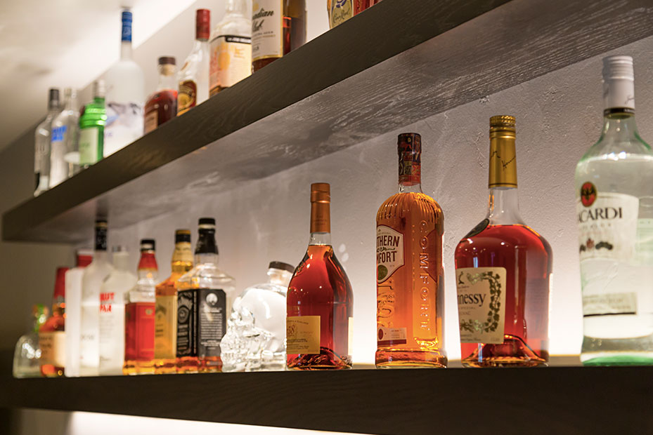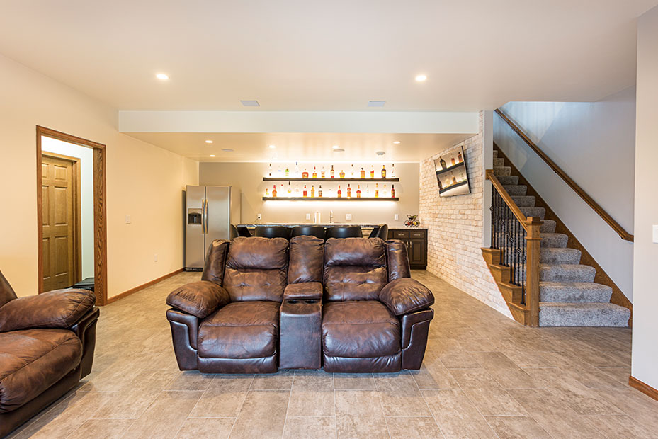 Basement Bar With a basement remodel like this, there is no question where party will be! Complete with beautifully lit floating shelves, TVs for the game, and the wet bar for storage and functionality, this basement is a hit.
